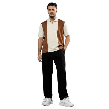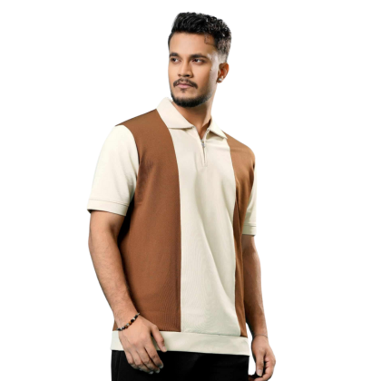A stylish, short-sleeved polo t-shirt featuring a bold vertical color-block design in Cream/Off-White and Brown. It has a classic polo collar with a modern zip-up placket instead of traditional buttons. This piece offers a sharp, retro-inspired look perfect for casual and smart-casual occasions.